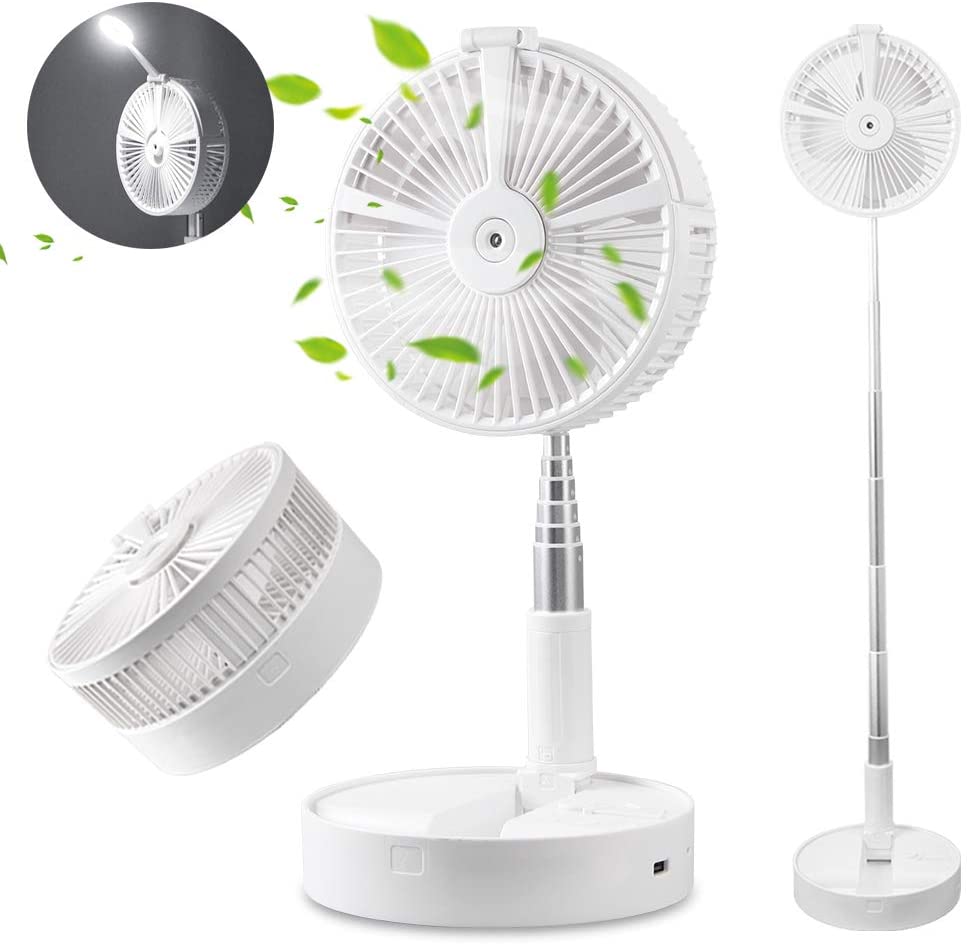 Highlights 5 Working Modes This Standing USB Fan is available with Low / Medium / High speed levels, natural wind mode and mist spray mode to meet your individual needs Angle & Height Adjustable The height of the table fan can be fully adjusted from 3.7″ to 39.3″ and 185 degree adjustable tilt Angle, can be used on desk or just use it as floor fan Rechargeable Battery Equipped with 7200mAh lithium battery, can be chargerd by computers, laptops, powerbanks, cellphone chargers. 6 hour charging time, 6-26 hours working time depends on different mode Foldable and Low Noise This portable hydrating fan is foldable, easy to carry and storage, make low noise(30-40db), perfect for outdoor travel, barbecue, party and indoor living room, babyroom, kitchen, sleeping, salaryman Built-in Night Lights This cooling office fan features with LED light, night lights and humidification function, can be used as a fan, desk light, night light, mini humidifier or even phone holder, a must-have good for air circulation in this hot summer Specification General Type: Fan Color: White Specification Power Consumption: 1.3w;2.8w;4.8w Charging Input: 5V/2A Mobile Power Output: 5V/1A Wind Speed: 2.3m /S ;3.0m /S ;4.0m /S Battery Capacity: 7200 mAh Usage Time: 6-24 hours Charging Time: More than 4 hours Weight & Size Product Weight: 2.2kg Package Weight: 1.26kg Product Size(L x W x H): 220.6 x 20.6 x 103.8cm Package Size(L x W x H): 22.5 x 22 x 12cm Package Contents Product x 2 Charging cable x 2 Instruction manual x 2