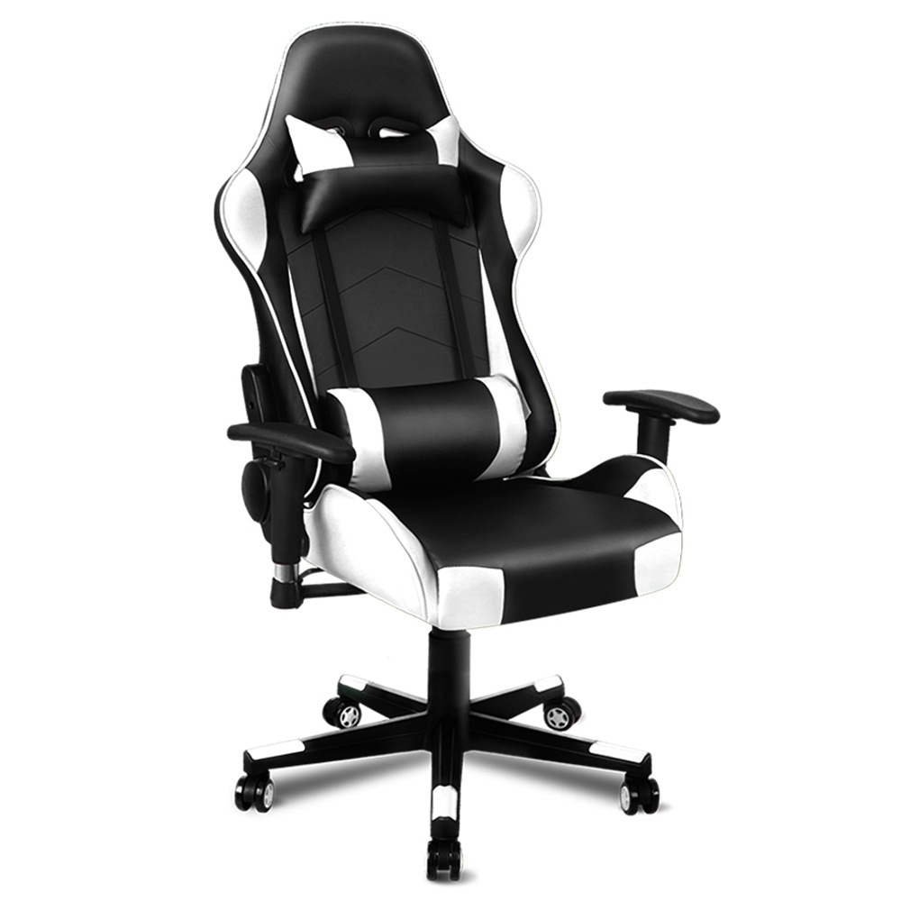 Highlights Rotatable and height adjustable 4D armrests S-curve design eliminates back and shoulder pressure Removable and height-adjustable head & lumbar cushions Up to 180 degrees back recline adjustment Able to lock the reclination position Premium universal wheels, smoothly 360-degree swivel High resilience foam, better weight distribution, and support Ideal for gamer and business uses Specification General Type: Chair Color: Black & White Specification Load: 180kg Swivel: Smoothly 360° swivel Rocking: Deluxe tilt adjustment Sitting Surface: PU Leather Seat Padding: Foam Chair Base: Nylon Frame: Metal Back Dimension: 53x90cm Seat Size: 58x55cm Seat Height: 9cm Armrest Adjustable: Yes Height Adjustable: Yes Recline: Yes Assembly: Yes Weight & Size Product Weight: 20kg Package Weight: 22kg Product Size(L x W x H): 75 x 75 x 137cm Package Size(L x W x H): 83 x 65 x 32cm Package Contents 1 x Alfordson office chair 1 x Assembly manual